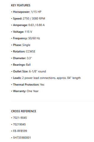 P5H73598-1, OEM Replacement, 1/15Hp, 3000 Rpm, 115 V, 3.3" Dia