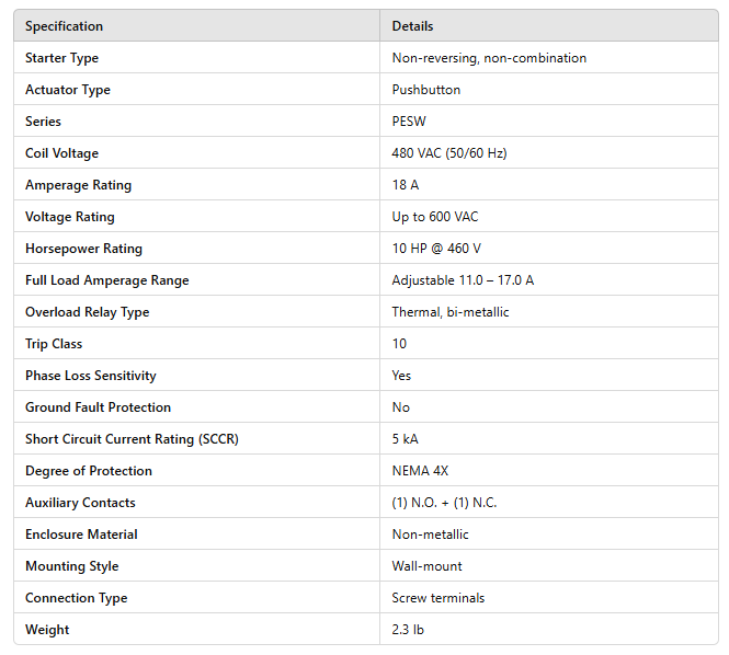 PESW-B18D39AX-R66, Enclosed Starter, 10Hp@460, 480 V Coil with Start-Stop Pushbuttons - Three Phase, 13438804 is backordered and will ship as soon as it is back in stock.