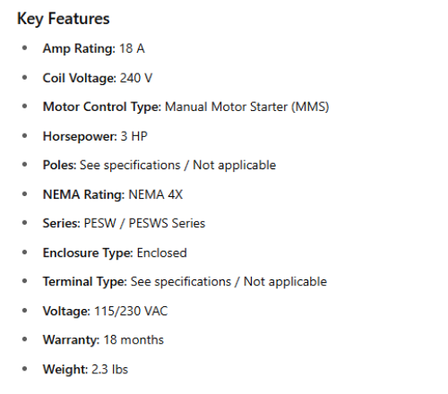 PESWS-B18V24AX-RM66, 3Hp, 208-240V with START/STOP + RESET Pushbuttons - Single Phase, Box 05, 14655798 is backordered and will ship as soon as it is back in stock.