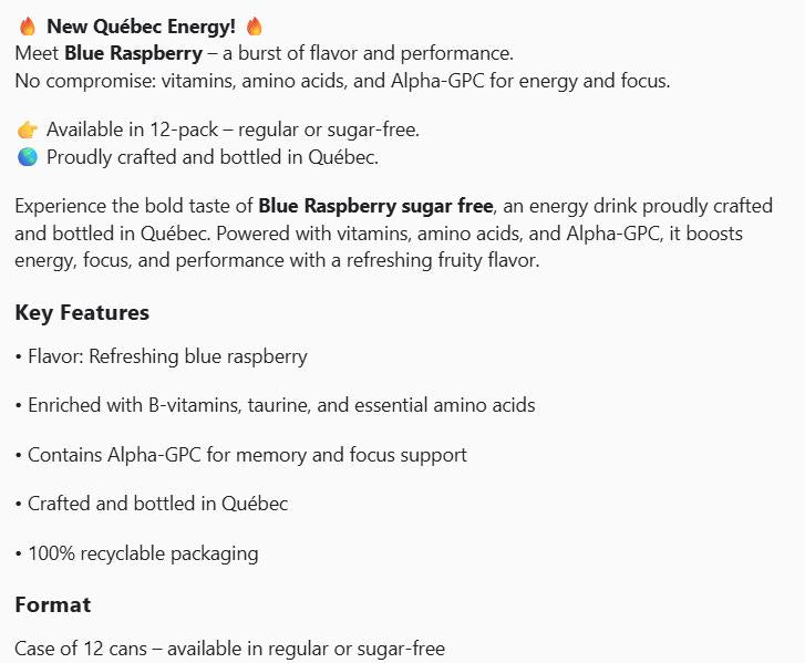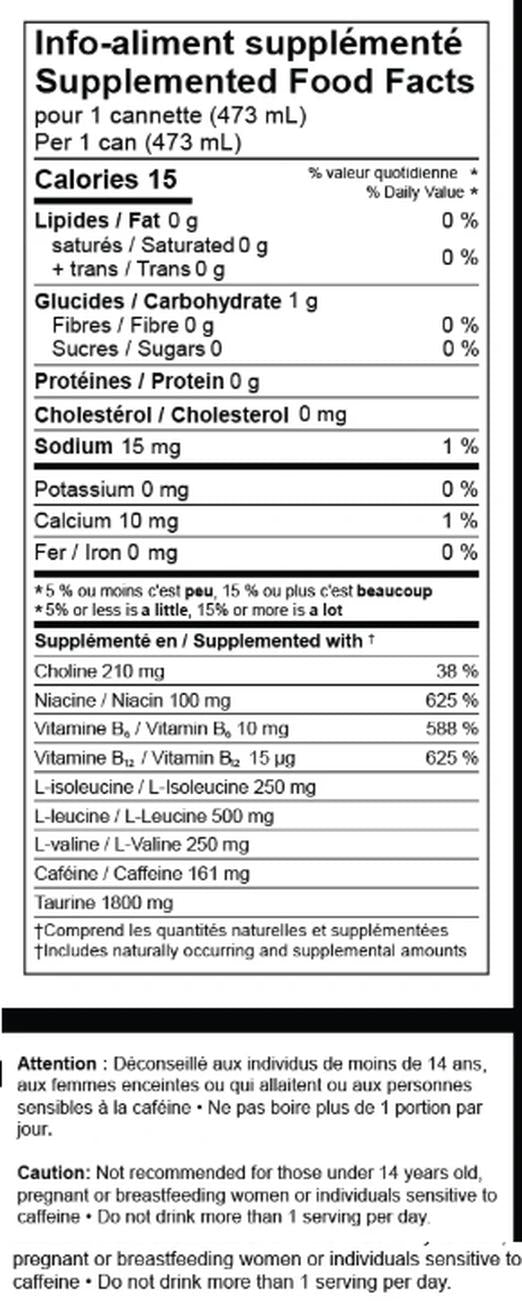 Experience the bold taste of Blue Raspberry sugar free, an energy drink proudly crafted and bottled in Québec. Powered with vitamins, amino acids, and Alpha-GPC, it boosts energy, focus, and performance with a refreshing fruity flavor.