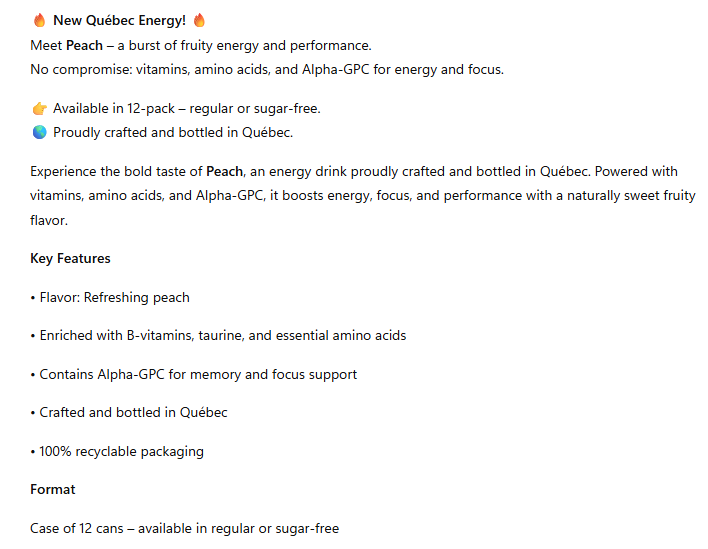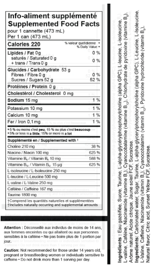Experience the bold taste of Peach, an energy drink proudly crafted and bottled in Québec. Powered with vitamins, amino acids, and Alpha-GPC, it boosts energy, focus, and performance with a naturally sweet fruity flavor.