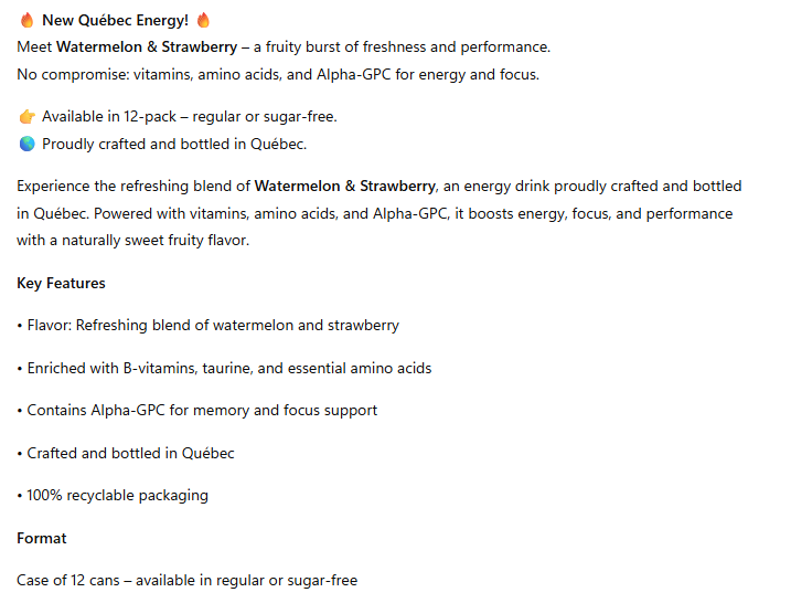 Experience the refreshing blend of Watermelon & Strawberry, an energy drink proudly crafted and bottled in Québec. Powered with vitamins, amino acids, and Alpha-GPC, it boosts energy, focus, and performance with a naturally sweet fruity flavor.
