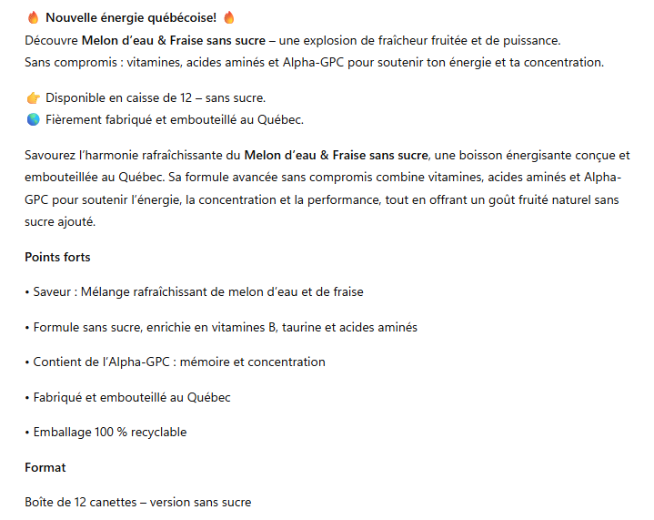 Savourez la fraîcheur fruitée de la Pêche, une boisson énergisante conçue et embouteillée au Québec. Sa formule avancée sans compromis combine vitamines, acides aminés et Alpha-GPC pour soutenir l’énergie, la concentration et la performance, tout en offrant un goût naturellement savoureux.