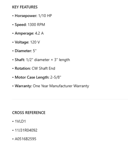 PVLD1, OEM Replacement, 1/10Hp, 1300 Rpm, 120 V, CWSE, 5" Dia.