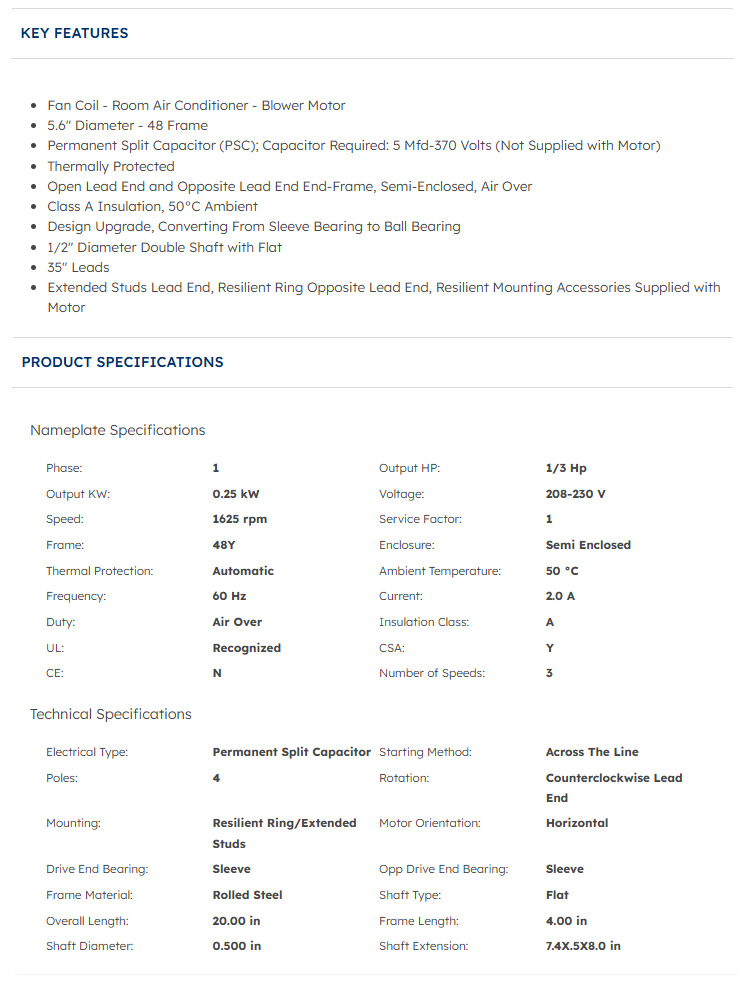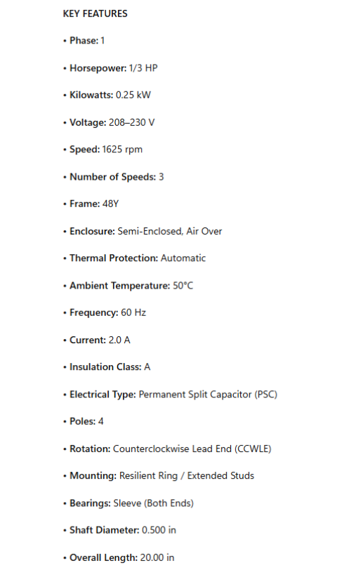RA1034, Fan Coil & Air Conditioner Motor, 1/3hp, 1 Ph, 60 Hz, 208-230 V, 1625 RPM, 3 Speed, 48 Frame, SEMI ENCLOSED