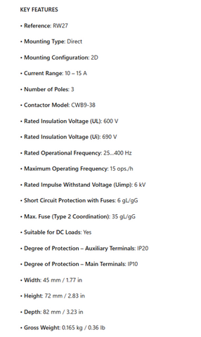 RW27-2D3-U015, Overload Relay, 3/p, 10-15A, FOR CWB CONTACTOR is backordered and will ship as soon as it is back in stock.