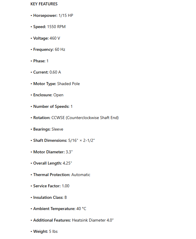 SS981, HVAC/R Motors, 1/15Hp, 1550 RPM, 460V, 3Ph, 60Hz, OPEN, CCWSE