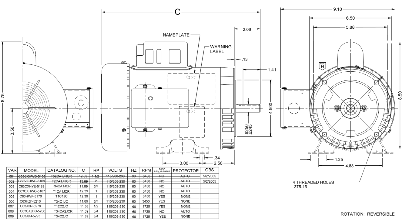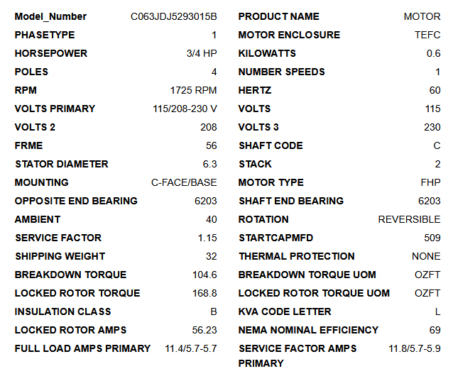T34C2JC, General Purpose Capacitor Start, 3/4Hp, 1725 RPM, 115/208-230V, 1PH, 60Hz, TEFC, Frame 56C, C063JDJ5293015B