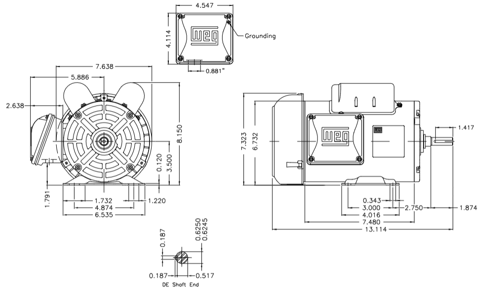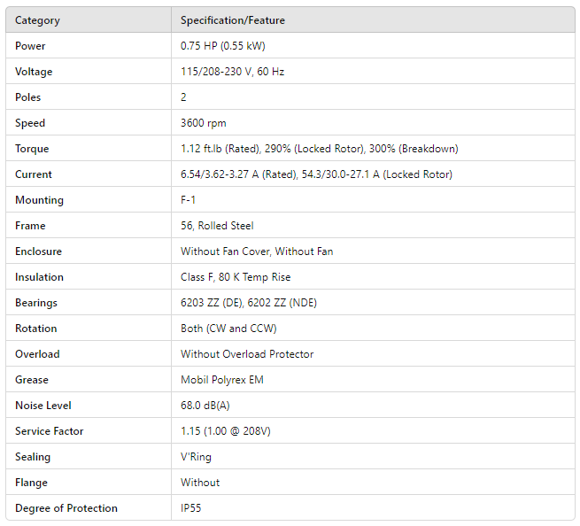 Torque 1.12 ft.lb (Rated), 290% (Locked Rotor), 300% (Breakdown)