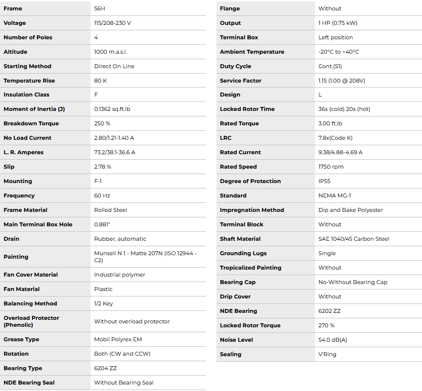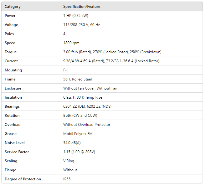Torque 3.00 ft.lb (Rated), 270% (Locked Rotor), 250% (Breakdown)