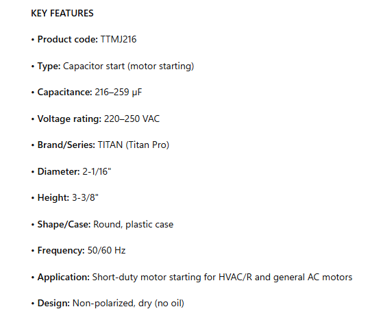 TTMJ216, TITAN CAPACITOR START 216-259MFD@220-250V Diameter: 2-1/16 Height: 3-3/8 is backordered and will ship as soon as it is back in stock.