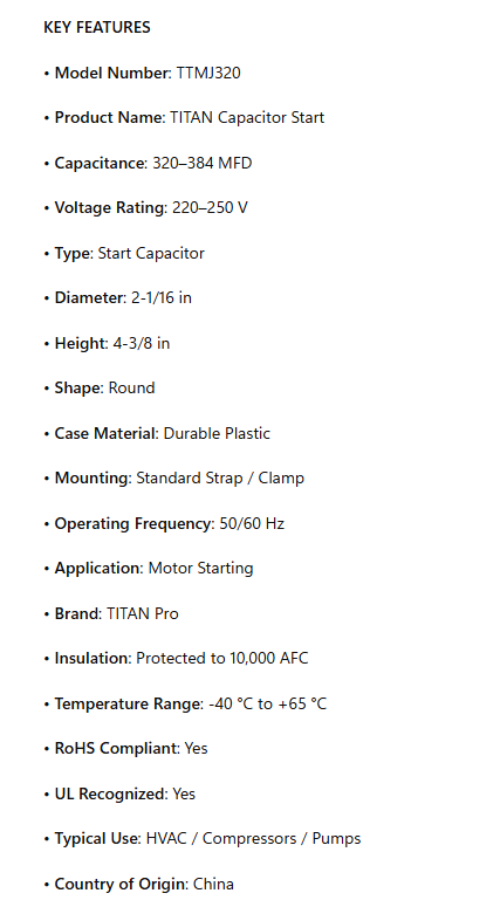 TTMJ320, TITAN Capacitor Start 320-384MFD@220-250V Diameter: 2-1/16 Height: 4-3/8 is backordered and will ship as soon as it is back in stock.