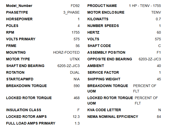 UN1T2GFC, ACCU-TORQ VECTOR DUTY, 1Hp, 1755 RPM, 575V, 3PH, 60Hz, TENV, Frame 56C, FD92