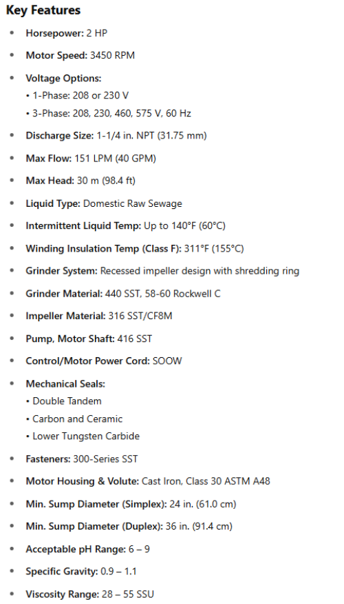 Min. Sump Diameter (Simplex): 24 in. (61.0 cm)