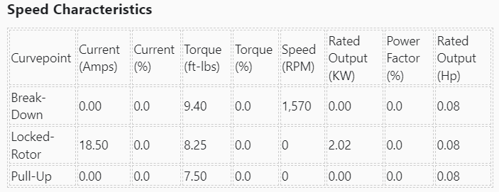 Curvepoint | Current (Amps) | Current (%) | Torque (ft-lbs) | Torque (%) | Speed (RPM) | Rated Output (KW) | Power Factor (%) | Rated Output (Hp) |