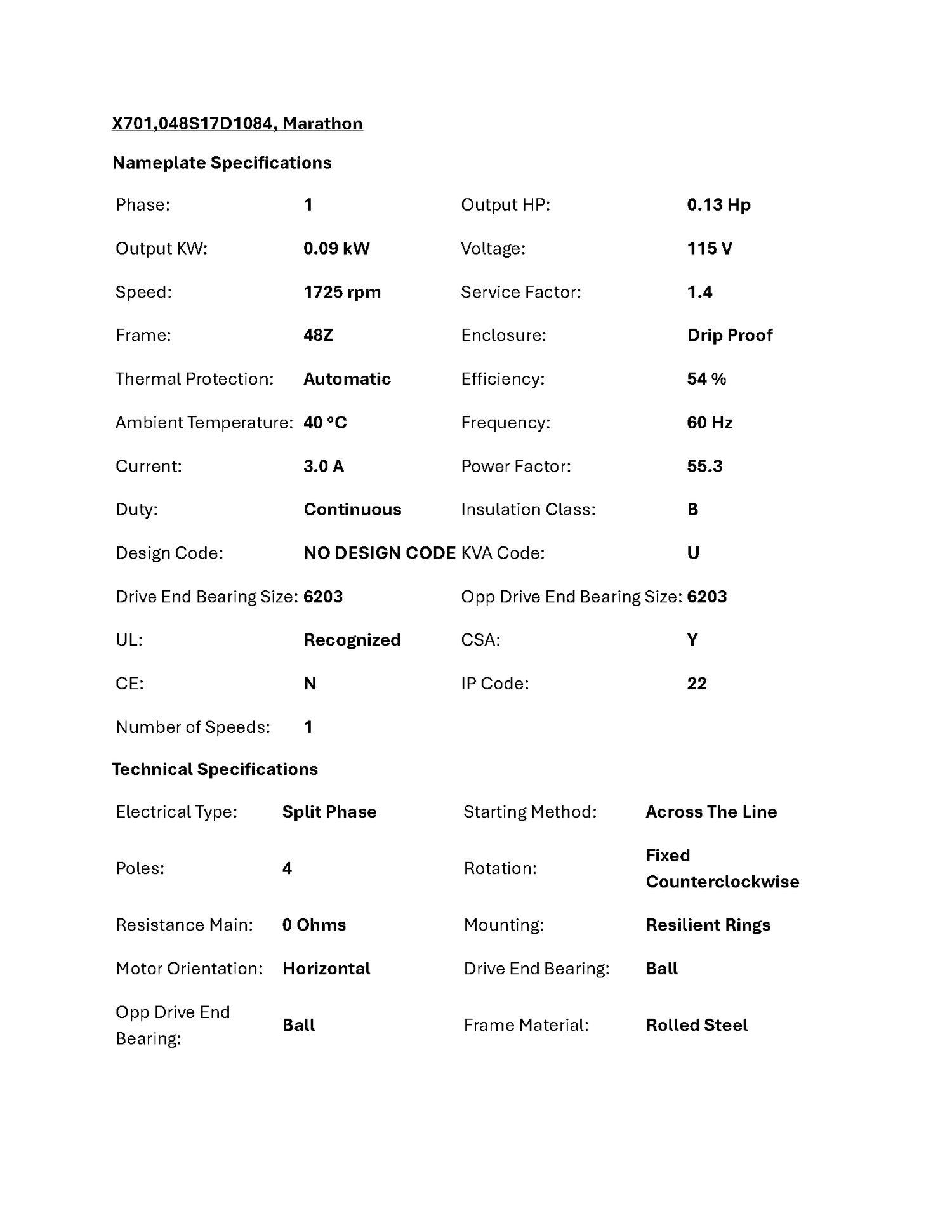 X701, 048S17D1084, Marathon, 0.13Hp, 1725 Rpm, 115 Volts, Frame:48Z, DP is backordered and will ship as soon as it is back in stock.