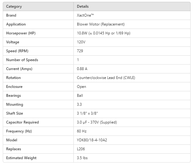 X99080843, XactOne , Blower Motor , 120V , 729 RPM , 60HZ , 1/69 Hp