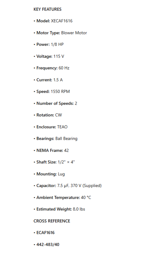 XECAF1616, Blower Motor, 1/8Hp, 1550 RPM, 115V, 1Ph, 60Hz, TEAO, Frame 42, CW