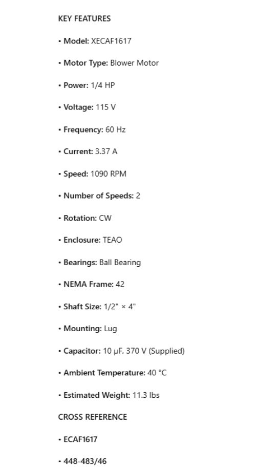 XECAF1617, Blower Motor, 1/4Hp, 1090 RPM, 115V, 1Ph, 60Hz, TEAO, Frame42, CW