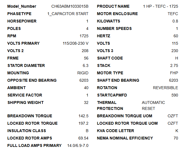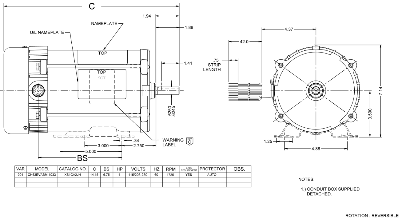 XS1CA2JH, EXPLOSION PROOF, 1Hp, 1725 RPM, 115/208-230V, 1PH, 60Hz, TEFC, Frame 56H, IP54, CH63ABM1033015B